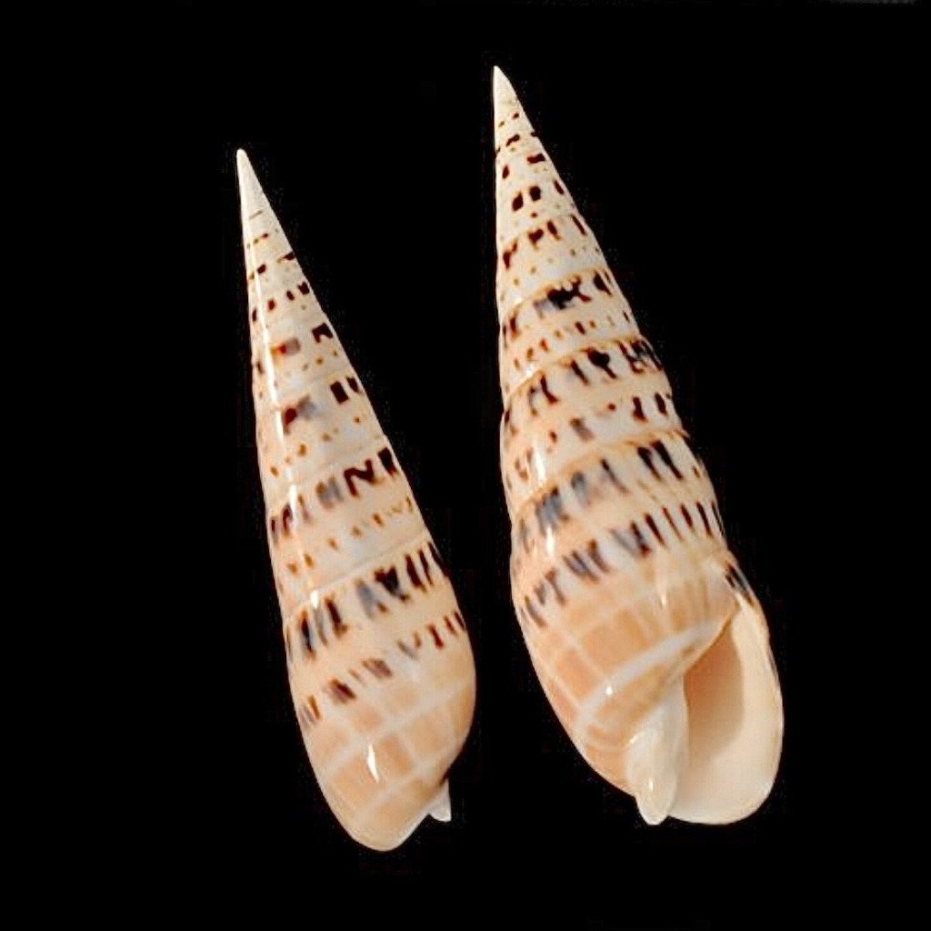 Marlin Spike is an auger shell belonging to the family Terebridae; species Terebra Maculata. They are heavy, glossy with a broad body whorl(complete turn of the shells imaginary axis). Young shells have weak vertical ridges; while older species become smooth. There color is cream with interrupted spiral bands of brown. The shell has been used as a boring instrument by coastal tribes. Marlin Spikes are found in shallow water, across the Indo-Pacific tropics from the Indian Ocean east to just south of the Japanese Sea to the northern Australian/New Zealand shores.