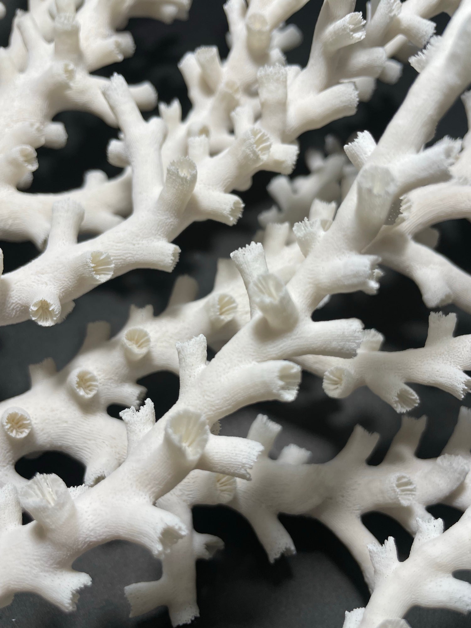 Octopus coral is a beautiful white ocean coral. Octopus coral have tentacle-like branches with small cup shaped structures, the branches typically stem out from a central trunk and angle upward. Branches are typically 1 to 3 inches thick